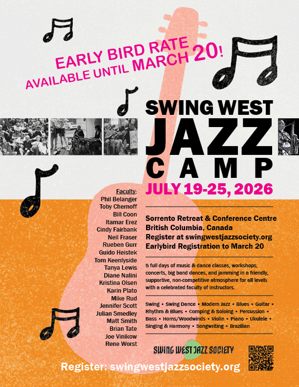 April 4, 2026: SWJS and will be holding a Fun(d)raiser concert, hosted by the Vancouver Odd Fellows Hall. An amazing lineup of Swing West Jazz camp faculty and alumni will be performing. This event will give a taste of how much fun unfolds at camp – starting with a swing dance lesson, followed by incredible performances and dancing into the evening. For tickets, you can RSVP and send an eTransfer to LBAJA4457@gmail.com – make sure to put your name and email in the eTransfer memo. See the poster on the SWJS website for all the details. Proceeds from the event will support Swing West Jazz Society and the 2026 Camp.